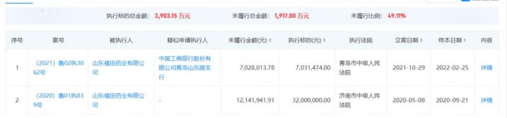 企查查数据显示,截至2025年12月12日该公司累计涉及司法案件50起,其中作为被告的案件占比64%。此外,其还存在两起被执行案件,例如立案时间2020年5月8日,执行标的3200万元,未履行金额约为1214万元,终本日期为2020年9月21日;另一起立案时间为2021年10月29日,执行标的金额为703万元,未履行金额为702.80万元,终本日期为2022年2月25日。因此,福田药业及公司法定代表人于军平被限制高消费。